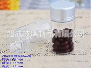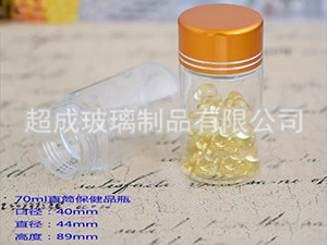 此款規(guī)格為直徑44mm,口徑40mm,高度89mm,容量70ml。原材料采用優(yōu)質(zhì)高硼硅玻璃,制作工藝為管制。款玻璃瓶主要用于高檔保健品,蟲(chóng)草含片,瑪咖精片,鹿茸膠囊,參茸,山參片,蟲(chóng)草粉,蜂膠,魚(yú)油,燕窩,海參等高檔奢飾品。